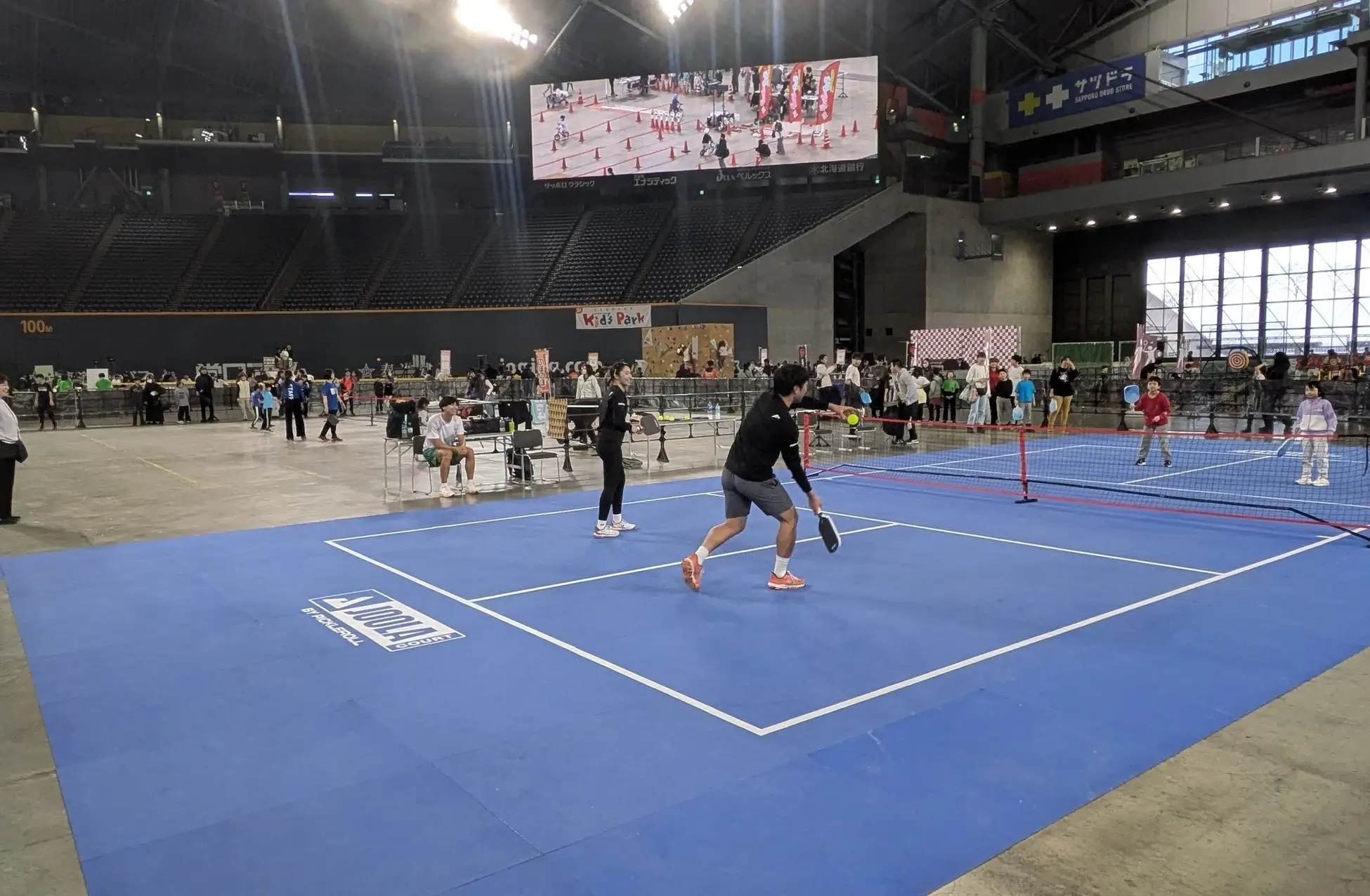 コートサイズはバドミントンと同じで、板状のパドルと穴あきボールを使用。誰でも簡単にラリーが続けられることから、お子さまはもちろん年齢に関係なく幅広い世代で楽しめる“令和の新スポーツ”として国内でも注目が高まっています。