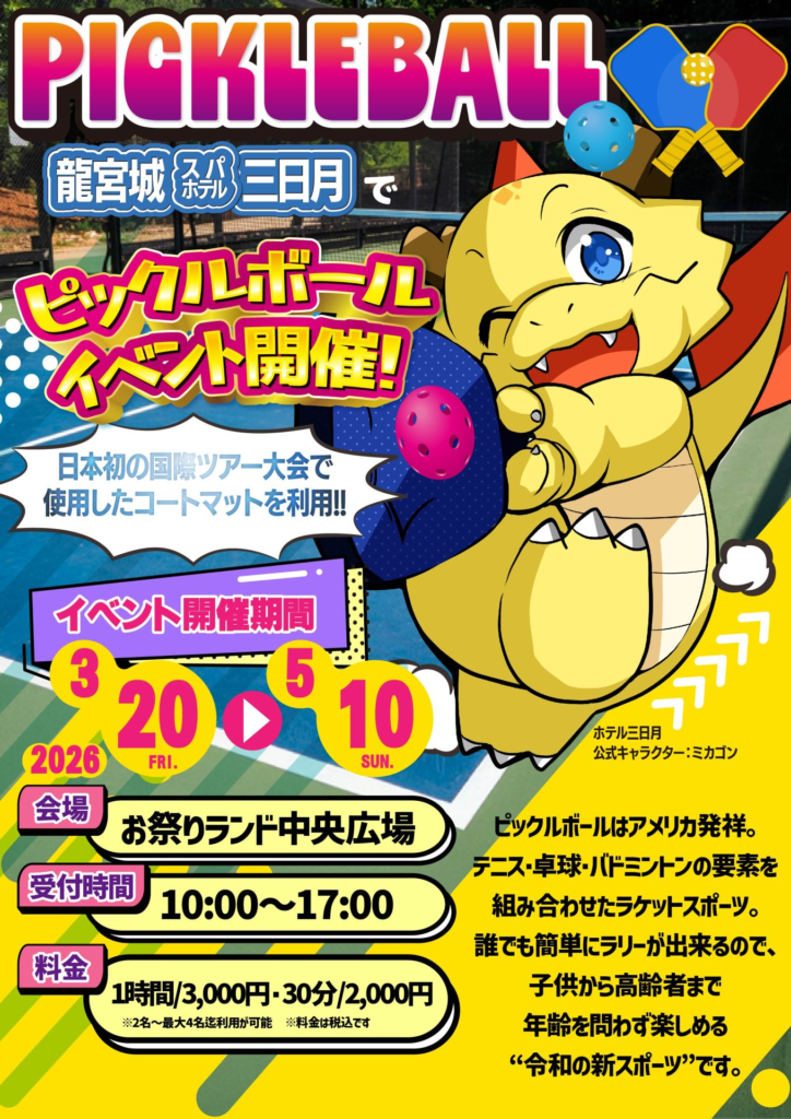 株式会社ホテル三日月では、龍宮城スパホテル三日月内「お祭りランド中央広場」にて、今、世界で最も成長しているラケットスポーツとして注目されている「ピックルボール」体験イベントを、2026年3月20日(金)より開催します。