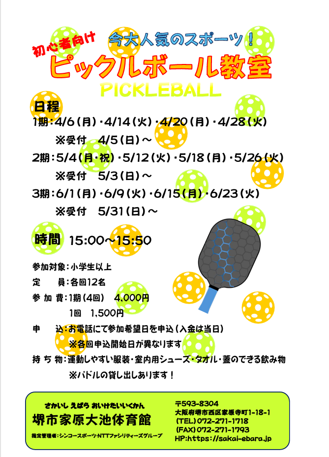 お電話でのご予約も受け付けておりますのでお気軽にお問い合わせください😊⭐️#ピックルボール #ピックルボール教室 #家原大池体育館 #堺市 https://t.co/7R1eOu8C8S