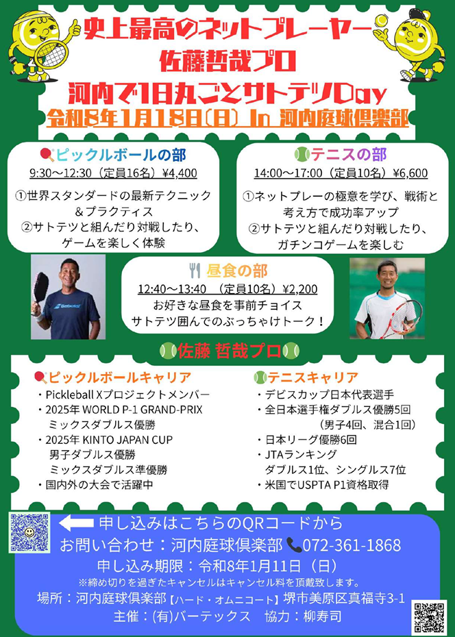 元デ杯選手で、しかもピックルボールでも活躍されている、佐藤哲哉プロのイベントを行います。