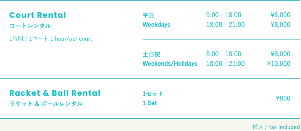 - 特徴:屋内コートのため、天気に左右されない。レッスン後、サウナ・お風呂の利用が可能。