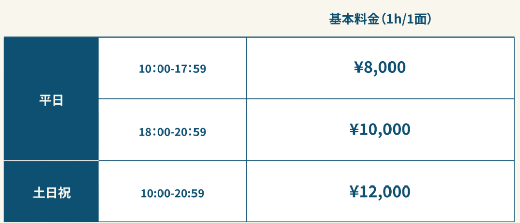 - 平日:11:00〜18:00 ¥6,000/18:00〜21:00 ¥8,000、土日祝:9:00〜18:00 ¥8,000/18:00〜21:00 ¥10,000
