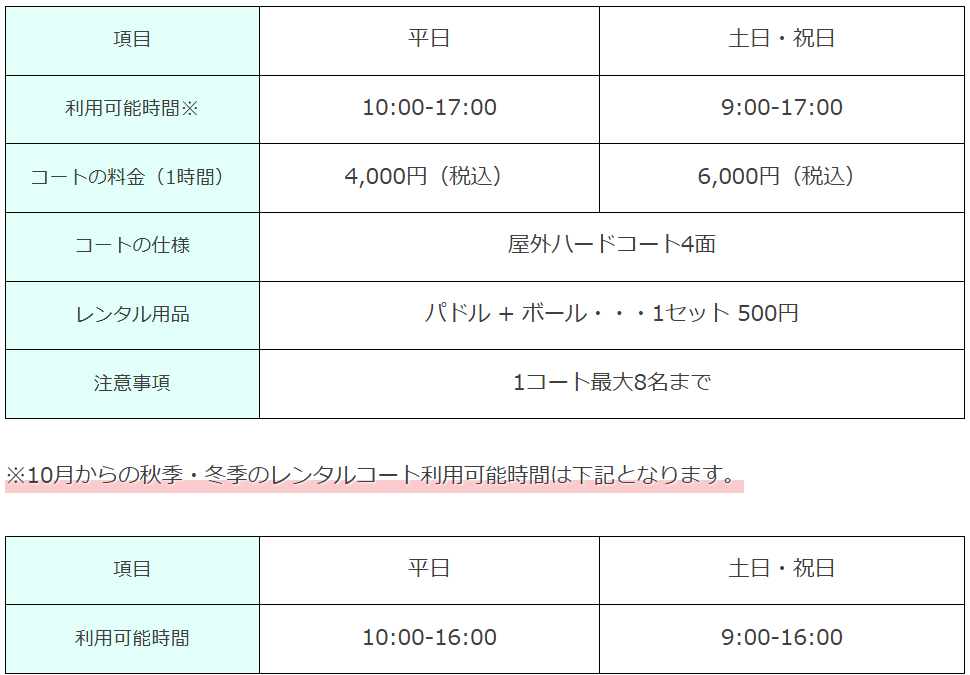 - 利用料金:ピックルボール体験会は毎週日曜日9:00~10:00(1人 ¥1,000)、ピックルボールレンタルコート(1面 2時間 ¥5,000)