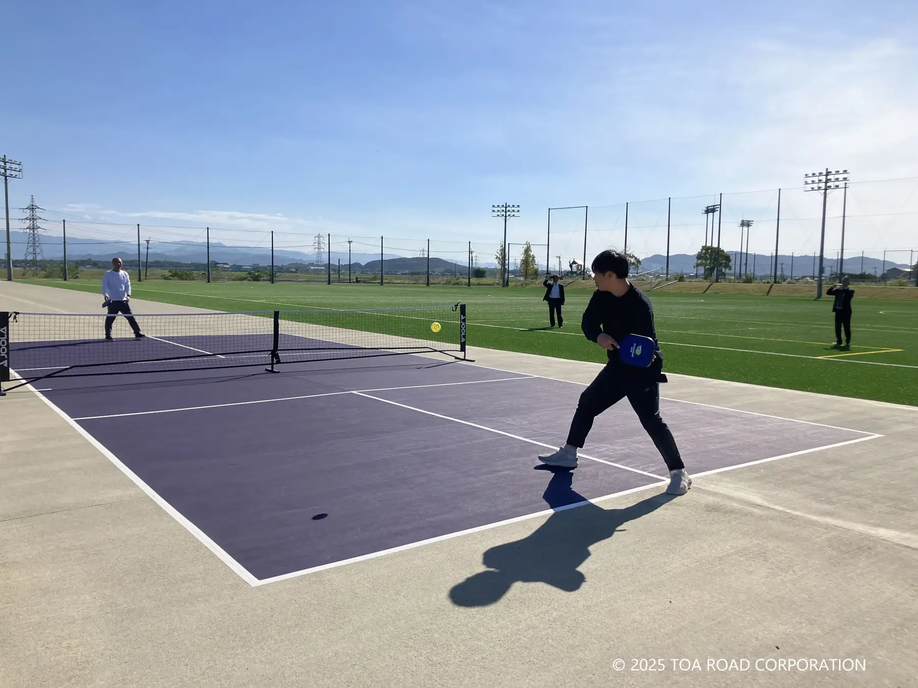 ■この度、東亜道路工業は熊本県上益城郡嘉島町にある熊本県フットボールセンター(愛称:COSMOS)施設内に、ピックルボール専用コート2面を施工しました。