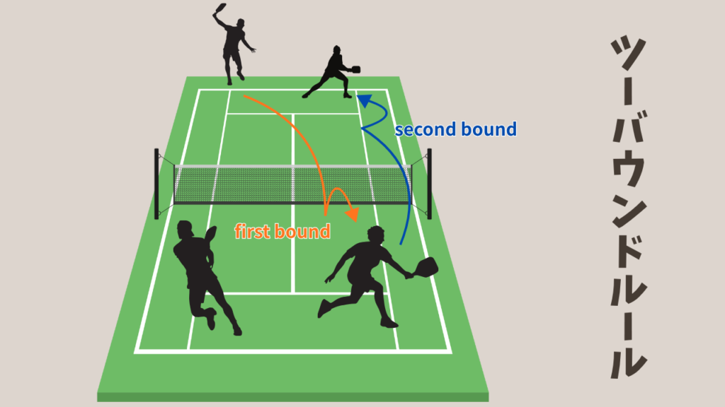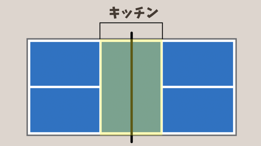 サーブはアンダーハンドで打ち、サーブのあとには両サイドで一度ずつバウンドさせる必要があります。さらに、ネット近くには「ノンボレーゾーン(通称キッチン)」と呼ばれるエリアがあり、その中ではボールをノーバウンドで打てません。